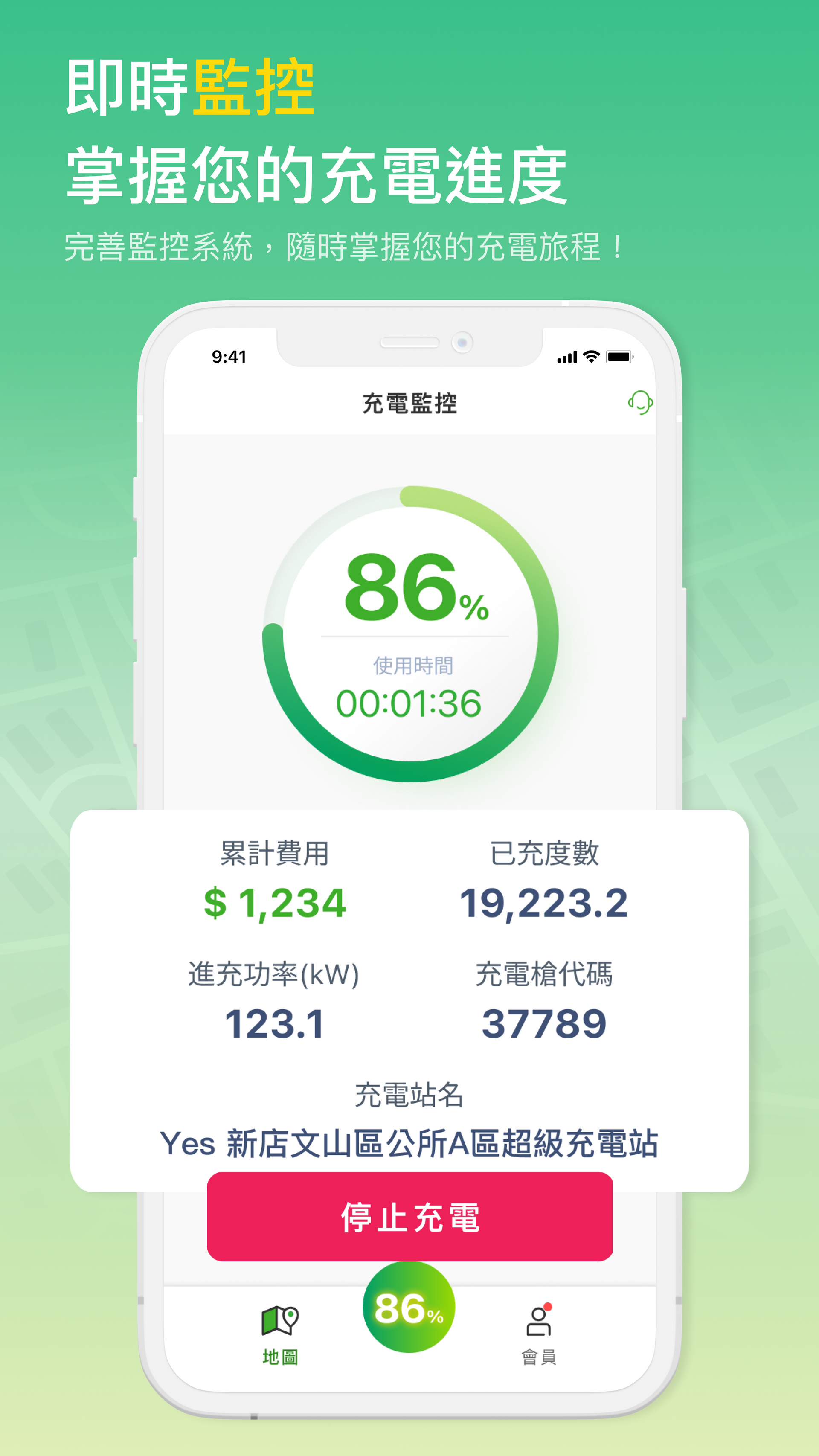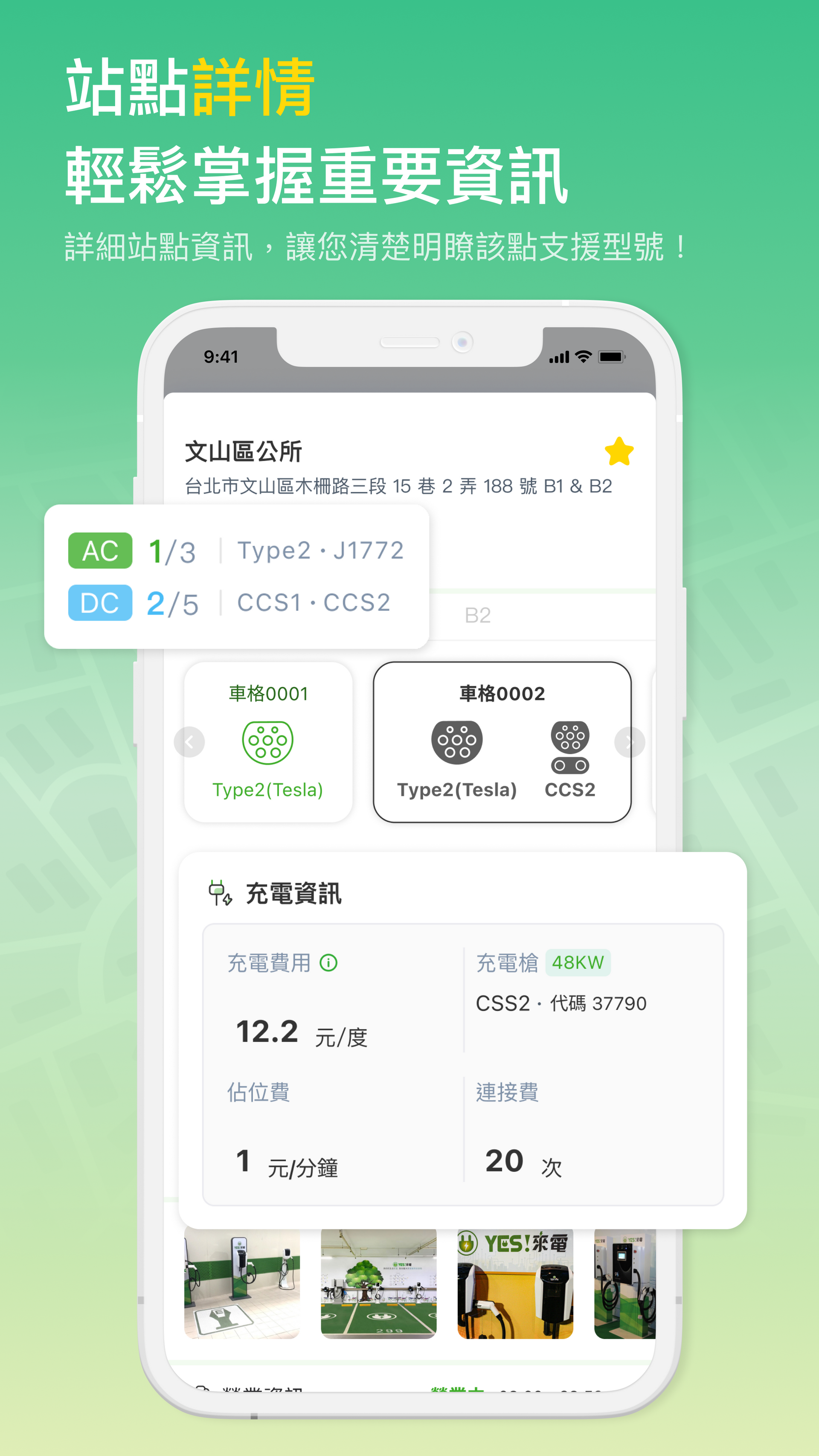 即時顯示站點資訊,快速找到需求的充電規格,充電中能掌握充電進度,透過動態推播讓車主資訊不漏接。